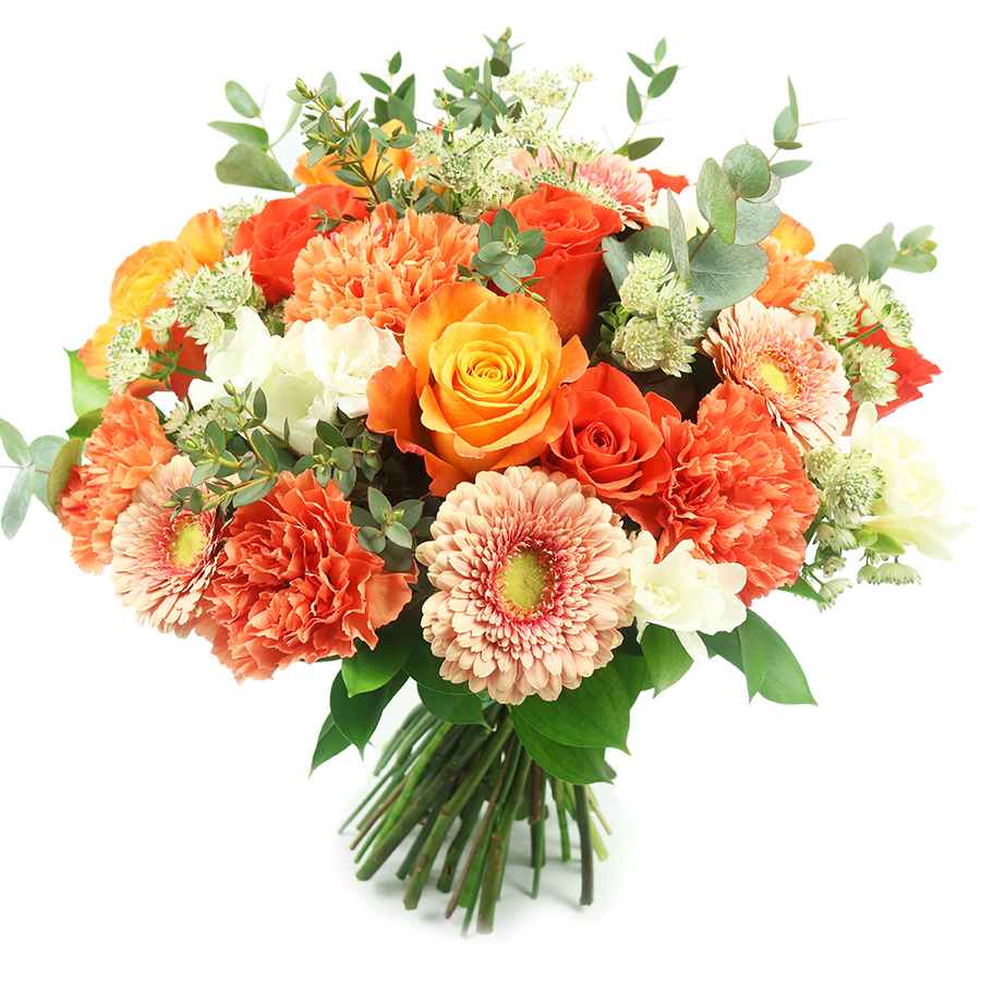Embrace the art of gifting with our Opulent Petal Arrangement. This luxurious bouquet is an exquisite medley of orange and yellow roses, vibrant orange carnations, charming peach gerberas, enhanced by aromatic eucalyptus and crisp greenery.