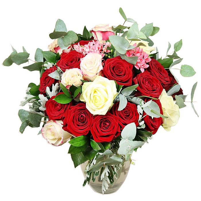 Brighten someone's day with our charming bouquet, showcasing a delightful blend of red and white roses, paired with fresh eucalyptus and colorful bouvardia. This arrangement is perfect for expressing love and appreciation.