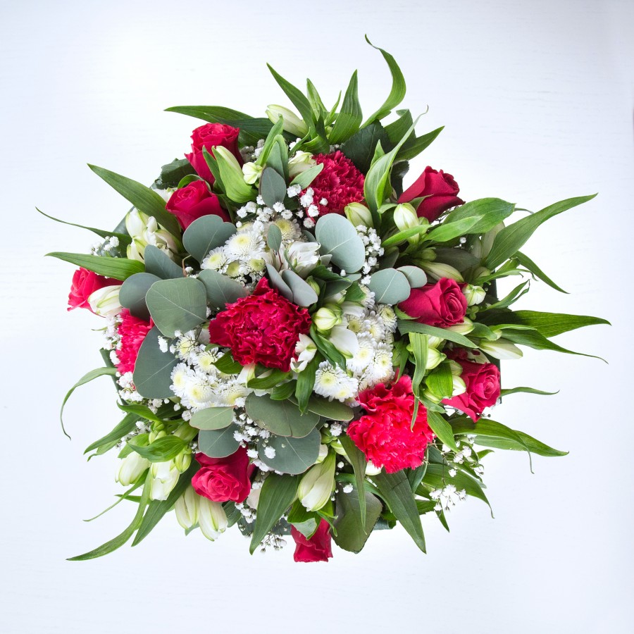 Celebrate life's special moments with our exquisite flower arrangement, meticulously designed to enchant the senses. This bouquet features a delightful medley: passionate red roses and charming carnations are paired with the gentle allure of mini white chrysanthemums and airy gypsophila. The inclusion of pristine white alstroemeria and lush aspidistra leaves brings balance and sophistication to the overall design.
