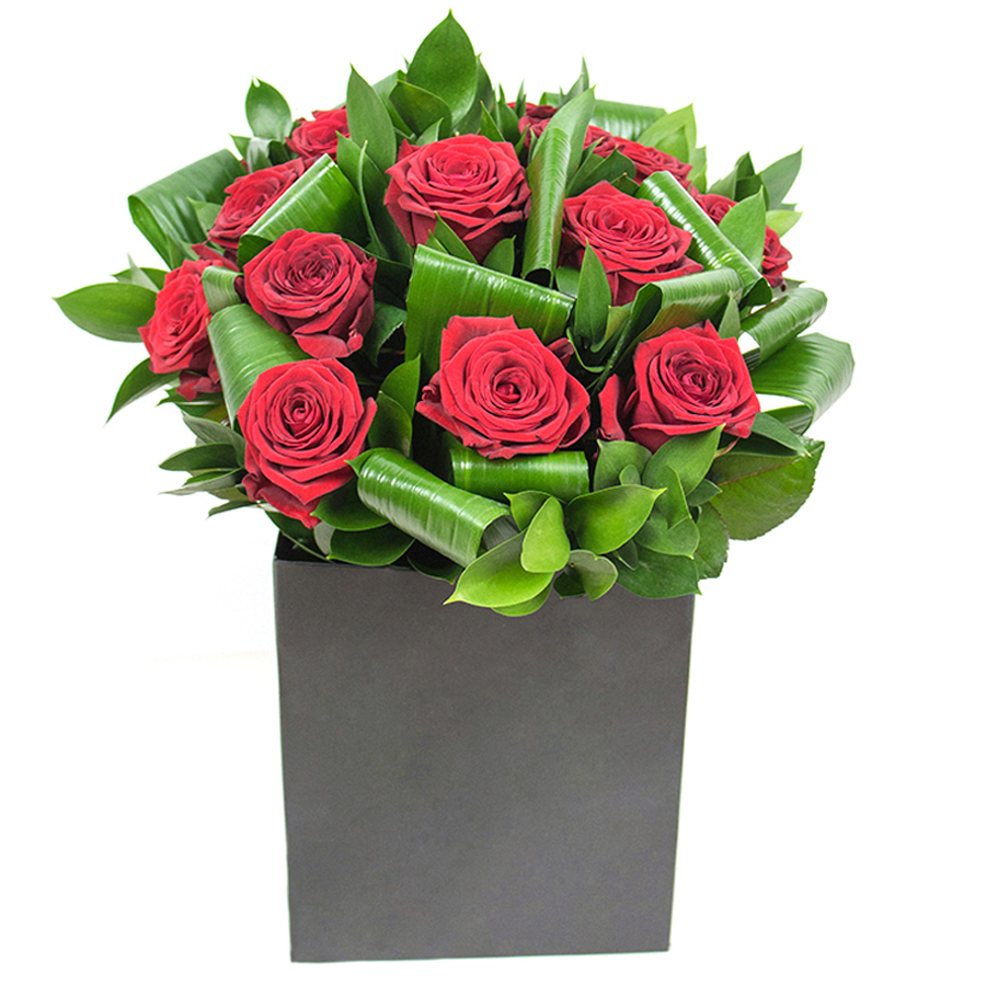 Embrace the beauty of our stunning red rose arrangement, complemented by lush aspidistra leaves and vibrant ruscus. This unique floral design brings grace and sophistication to any setting.