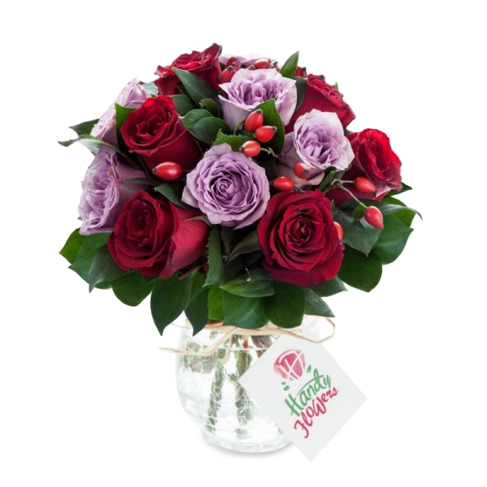 Indulge in the splendor of our meticulously crafted bouquet, combining the softness of velvet roses with the striking beauty of purple shade roses. This unique arrangement is perfect for any special occasion.