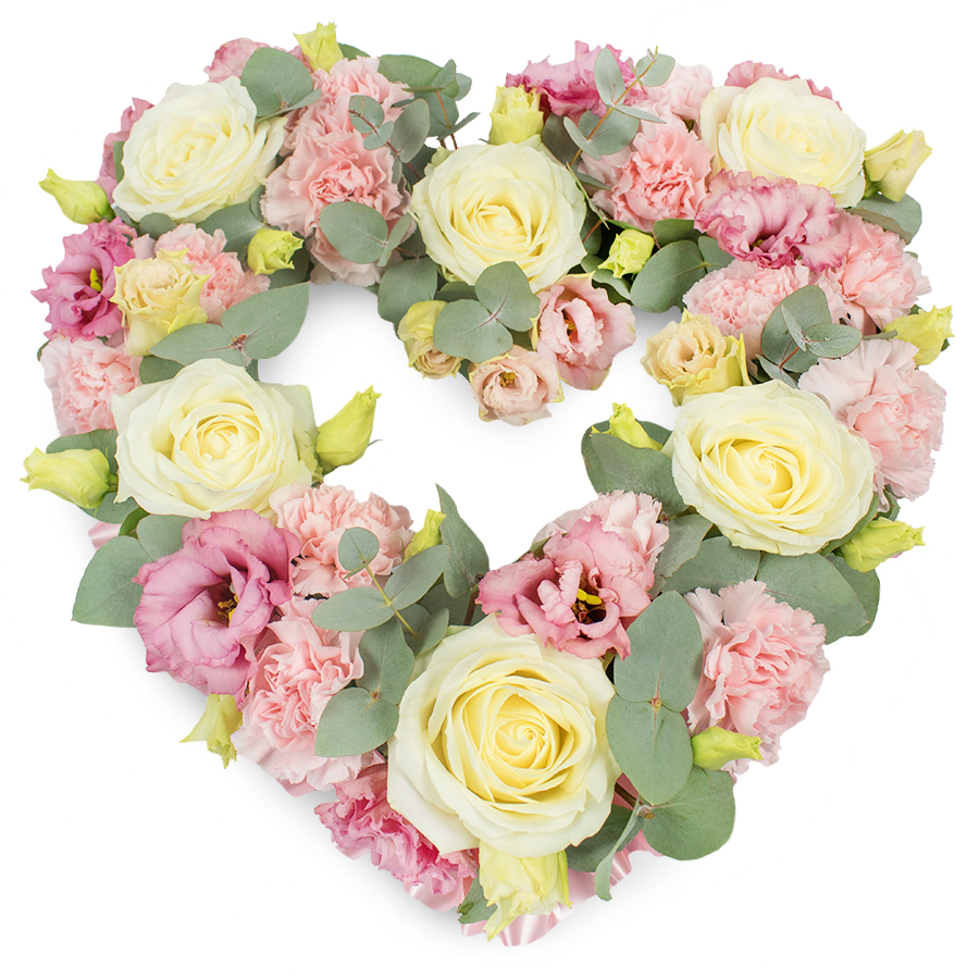 Honor cherished memories with our Timeless Tribute Arrangement, meticulously designed to convey your heartfelt sentiments. This exquisite bouquet features pure white roses, soft pink carnations, delicate pink lisianthus, and fragrant eucalyptus leaves.